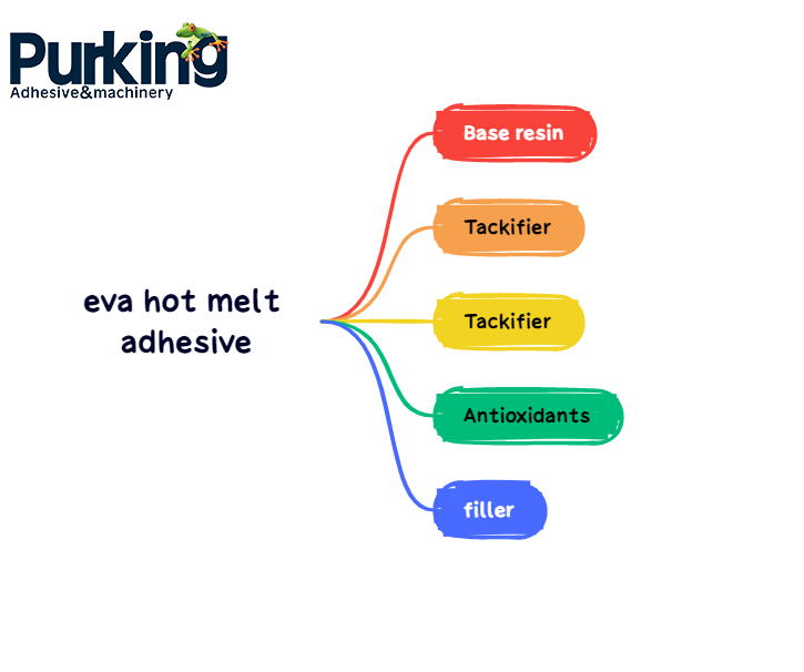 EVA hot melt adhesive is usually composed of EVA resin, tackifying resin, viscosity regulator, antioxidant, filler and so on.