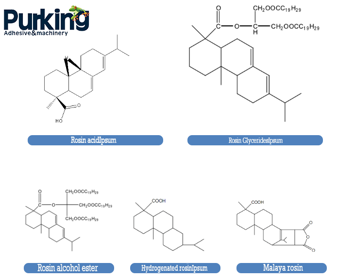 The tackifying resins commonly used in EVA hot melt adhesives are mainly divided into three types: rosin resins, terpene resins and petroleum resins. The main component of rosin is abietic acid (structure shown in Figure 2), which accounts for more than 90% of the total amount, and there are also a small amount of fatty acids and neutral substances. The structure of rosin acid contains double bond and carboxyl group, has strong reactivity, is unstable under light, heat and oxygen conditions, shows poor aging resistance, poor weather resistance, and is prone to discoloration and other phenomena. Therefore, on the basis of rosin, various derivatives such as hydrogenated rosin, disproportionated rosin, polymerized rosin, esterified rosin and maleated rosin are derived (the structure is shown in Figure 2). These derivatives can not only improve the instability of rosin, but also endow rosin with more excellent properties, and are widely used in tackifying resins.