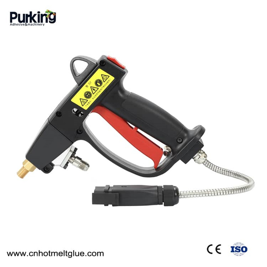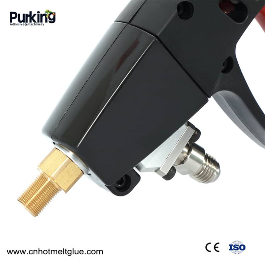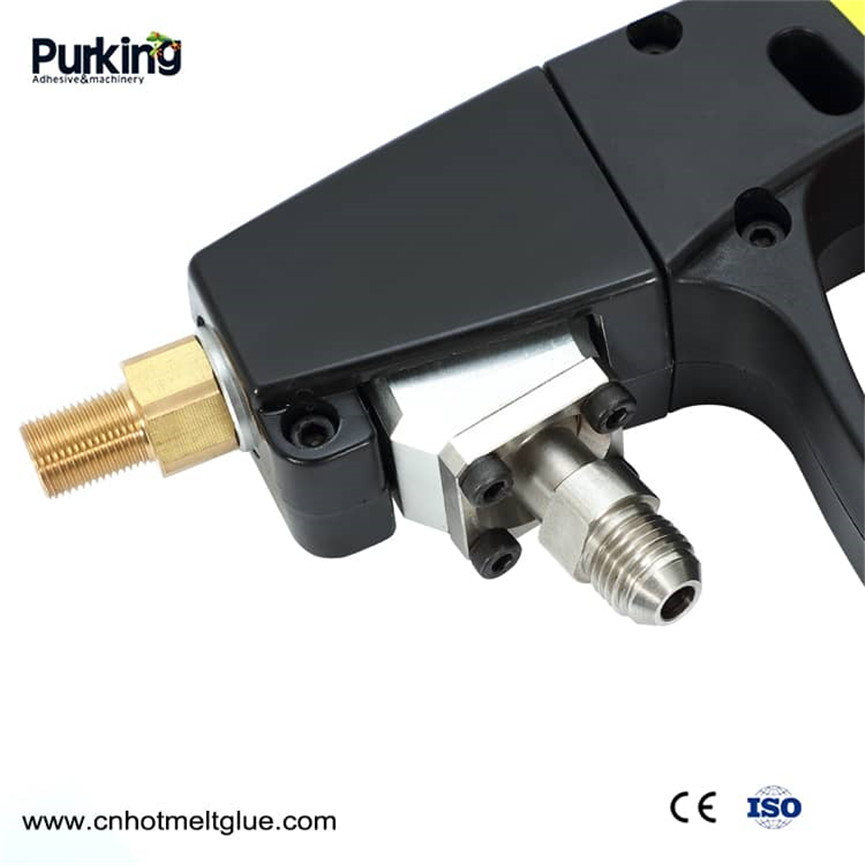 A: Our hot melt glue gun adopts precise and unique fiber nozzle design, reasonable and simple structure, easy to clean, precise spray glue control, excellent atomization effect, truly non-woven fabric, perforated film spray glue without reverse osmosis.